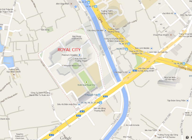 Royal City có địa chỉ: 72A Nguyễn Trãi – quận Thanh Xuân – Hà Nội. Đây được xem là vị trí thuận lợi, dễ dàng kết nối các khu vực trung tâm thành phố cũng như dễ dàng di chuyển ra khu vực ngoại thành phía Tây và Nam Hà Nội. Royal City Nguyễn Trãi chỉ cách: